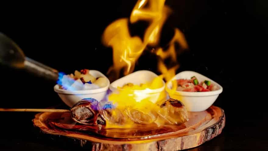 Shellfish responds particularly well to flambé because the cooking time stays short and the aromatics remain sharp throughout the process. Prawns cooked with garlic, chilli, and butter can be flambéed just before they finish cooking, once the prawns have turned opaque and begun releasing their natural juices. Alcohol is added at this stage and ignited so the flame lifts the sweetness of the prawns and mellows the sharpness of garlic without masking it. This approach appears widely in Mediterranean and Latin kitchens and suits fast, interactive cooking for starters or small plates. White rum keeps the flavour light and clean, while dry brandy or tequila introduces a sharper edge that pairs well with chilli heat.