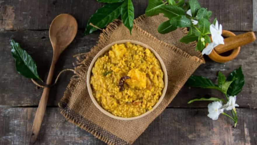 The dish begins with lightly roasted yellow moong dal cooked alongside short-grain rice in a 2:1 ratio. Fresh ginger, turmeric, and salt lend mild heat. The tempering of ghee, black pepper, cumin, and crushed garlic is poured over the cooked mixture to add depth. Served with a spoon of pickle or plain curd, it creates a complete meal that feels wholesome without excess oil or spice.