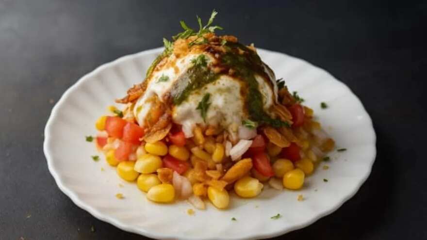 - Mix corn, onions, tomatoes, coriander, and chaat masala. Add crushed papdi.