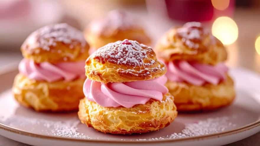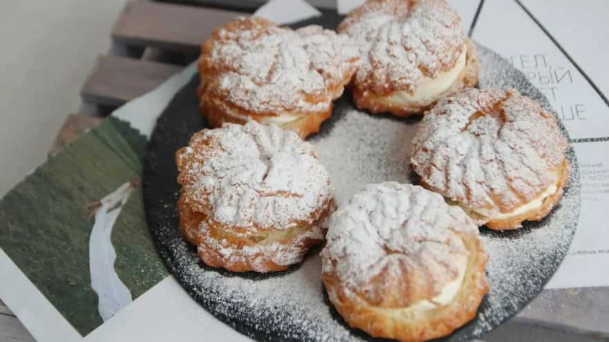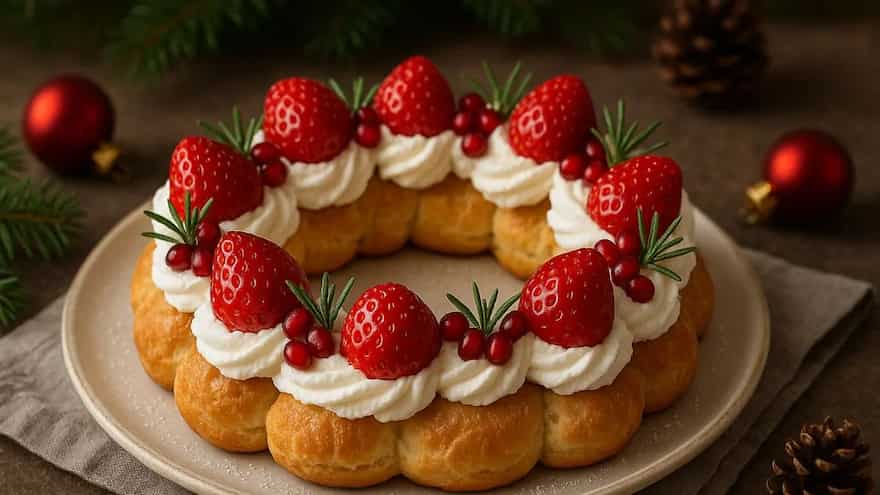 A cream puff wreath borrows its personality from the classic Christmas wreath everyone spots on doors, tabletops and shop windows through December. The round shape has always meant celebration and welcome, and somewhere along the way people started borrowing that shape for desserts. It makes sense once you think about it, because a wreath already looks like something you want to place right in the centre of a gathering. Cream puffs themselves come from choux pastry, which sounds complicated until you watch it come together in a pan. It starts with butter and water, then the flour goes in, and the whole thing turns into a dough. Eggs go in next, and suddenly the mixture becomes shiny and smooth. When you pipe it out and bake it, the dough puffs up and opens a little pocket inside, ready for cream. These puffs have been around for ages, floating through European bakeries and then into home kitchens everywhere, mostly because they feel light as air yet indulgent at the same time. Home chefs and food bloggers began arranging these puffs in a circle come holiday season, and the idea stuck. A ring of small pastries already looks inviting, and once it cools down, it becomes the perfect base for cream, fruit, chocolate and whatever else feels festive.