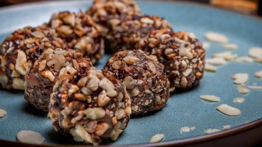 - Press a few chopped hazelnuts into the centre of each ladoo.