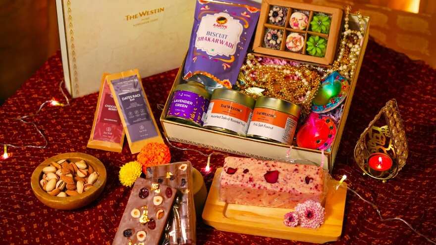 The Deccan Aura Hamper captures Diwali’s sensory warmth through rose-infused raisins, artisanal treats, and tea cakes. Its understated packaging—crafted in reusable tin and cotton—mirrors Westin’s philosophy of sustainable sophistication: elegance with minimal footprint.