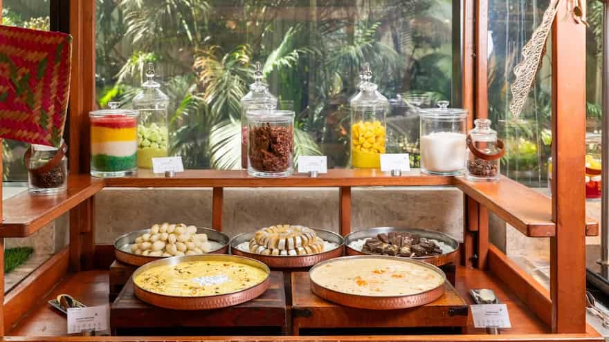 At Hilton Bangalore Embassy Golflinks, the festive brunch unfolds in an elegant setting. You can begin your meal with Tandoori Paneer Skewers, Mini Chicken, and Samosa Sliders. Then, make your way to the rice bar for Saffron and Fried Nuts Biryani. Fill your plates with creamy curries before giving in to the irresistible dessert counter laden with Gulab Jamun Cheesecake bites, Chocolate Coconut Barfi, and much more.