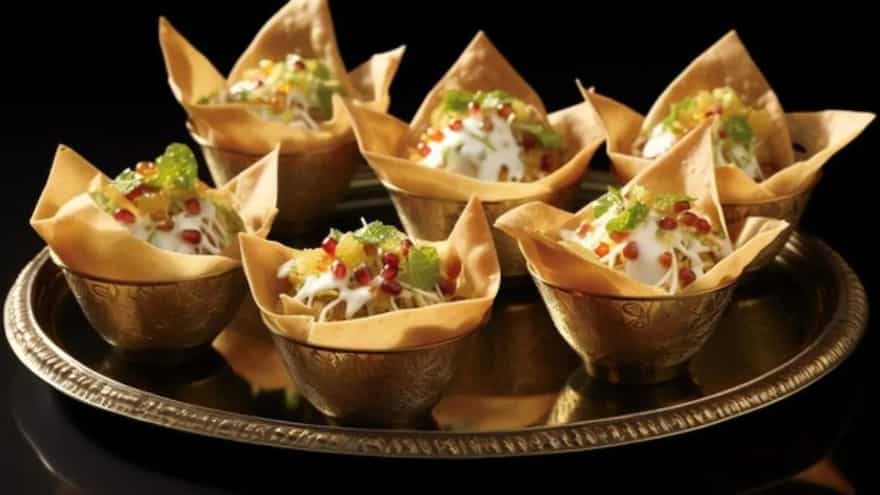 Can you think of traditional samosa chaat, but being served in bite-sized edible pieces? Strange, isn't it? To turn this classic favourite into a fusion dish, crush the mini samosas and layer them with tangy and spicy tamarind chutney, cooling yoghurt, spicy chole, and a garnish of sev and some pomegranate. This fusion snack blends Indian street-style flavours with modern display. Each bite has a burst of contrasting textures, that is crispy, creamy, tangy, as well as spicy, producing a perfect combination for party platters. Samosa chaat cups give all the festive vibes and are irresistibly delectable, perfect for those who love vibrant street food experiences with a modern twist.