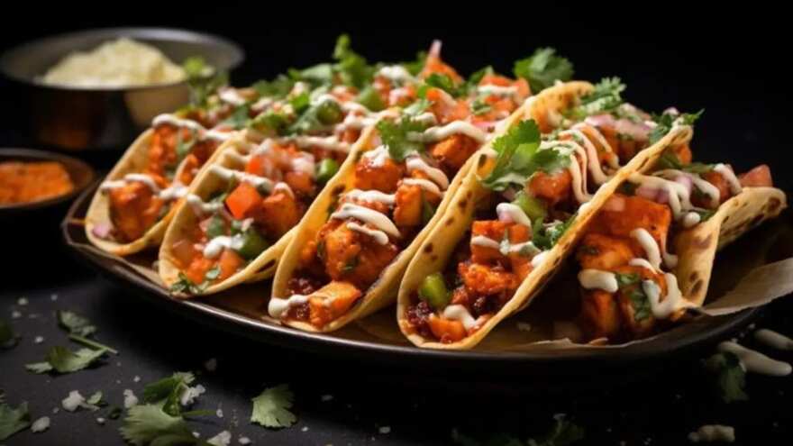 A creative Indian twist to Mexican food, these tacos are prepared from smoky, marinated paneer cubes tucked into soft tacos with some crunchy veggies and mint chutney mayo. The flavours combine the spicy appeal of Indian tandoori with the freshness of Mexican street food. Every bite produces a burst of warmth, creaminess, and tang, ideal quick snacking food for festive gatherings. Paneer tikka tacos perfectly balance the tradition along with the trend, making these a crowd-pleaser for Diwali parties that desire something special but familiar.