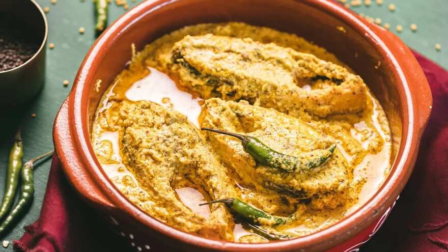 - Coat Hilsa fish pieces with the mixture. Place coated fish in a tiffin box with slit green chillies on top.