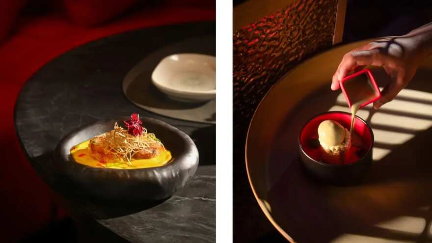 We also dance between techniques through the course of this dinner: precision gives way to pluck with our next appetiser: fresh bluefin tuna dressed up with a bright squeeze of ponzu and golden foil sits on a crispy rice toast; absolutely decadent, it’s like eating a seafood toast that has graduated with flying colours. We’re invited to celebrate the Yamayaki Festival, a winter festival from Nara, Japan, where the grass on Mount Wakakusayama is set on fire. Open-fire cooking is the charm of this festival, and so, on a hot lava stone trimmed with mashed potato, strips of lamb loin are prepared for us tableside. A generous splash of whiskey flambes the meat, an onion-soy sauce injects flavour and scallion chiffonade, sesame seeds and fried garlic round off the party. Think: meat-and-potatoes but in a handstitched suit.