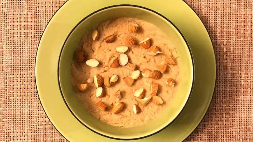 6. Transfer to a serving bowl, garnish with the chopped almonds, and serve while it is still warm for the best experience.