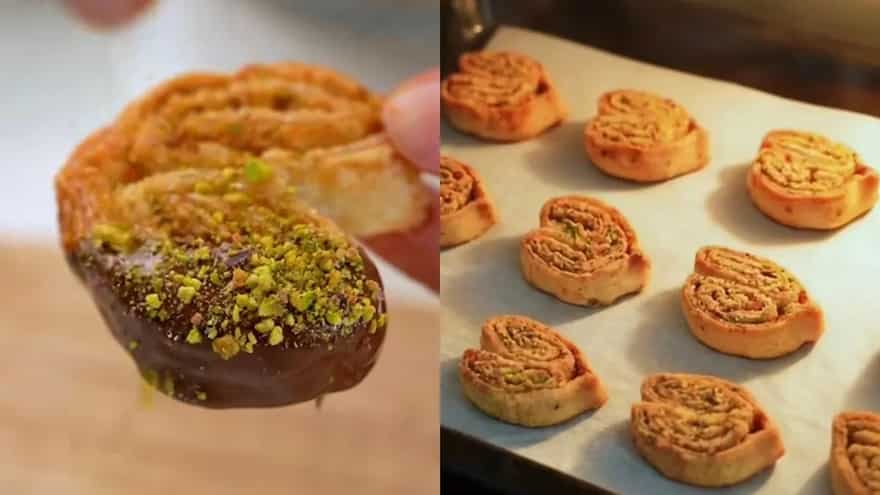 6. Cool the pastries completely. Dip them halfway into melted chocolate, sprinkle the coarse pistachios on top, and let them set before serving.