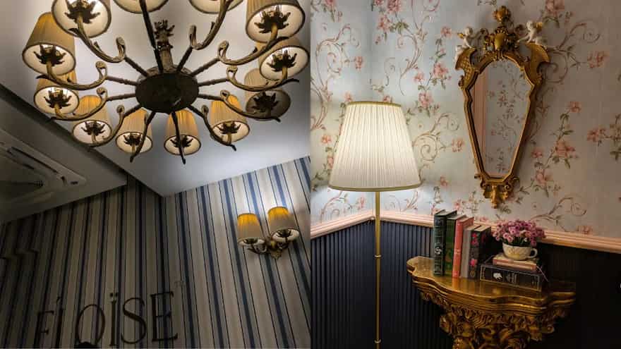 Éloïse's royal blue door and irresistible desserts greet you. The pastel colors, vintage brass accents, and delicate lighting create a timeless and modern space. The cafe's corners are meticulously designed to reflect the owner's love of European culture, making it a visual delight.