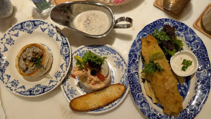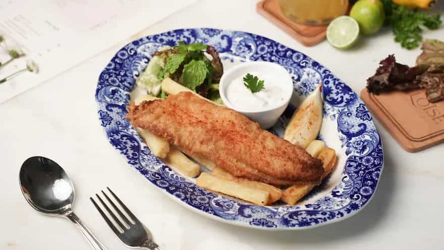 You will hardly find someone who doesn’t love Fish and Chips. This true British classic, here, can sweep someone off their feet. The fish is encased in a crispy, golden batter that cracks satisfyingly with each bite. The interior is tender, flaky, and sumptuous. Paired with golden fries that are crispy on the outside and soft on the inside, this dish is comfort food at its finest.