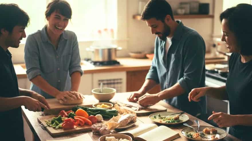 People arrive before the food is ready. Someone helps chop. Someone else sets the table wrong. The conversation lulls. The phone stays away. There’s awkwardness. There’s participation.