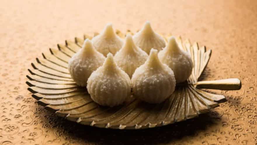 Coconut barfi is a classic sweet prepared for Ganesh Chaturthi bhog. Made with freshly grated coconut, condensed milk, and a hint of cardamom, the barfi melts in the mouth. The white colour of the sweet represents purity and devotion, making it a fitting offering to Lord Ganesha. In Kolkata, coconut barfi often comes garnished with pista or saffron strands for extra richness.