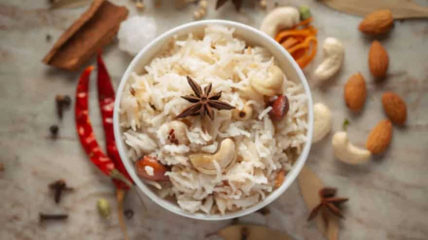 Kolkata introduces its festive rice dish, mishti pulao, into the bhog platter for Ganesh Chaturthi. Made with short-grain Gobindobhog rice, ghee, cashews, raisins, and a pinch of sugar, the pulao is slightly sweet yet aromatic with bay leaves and cloves. Paired with a curry, this dish adds a savoury-sweet balance to the bhog, showing the Bengali flair for festive meals.