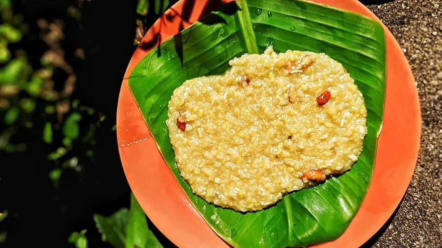 First, roast moong dal in a dry pan for a few minutes until the colour changes slightly. Wash and cook the rice and dal together until they turn soft. Melt jaggery in a little water and strain it to remove any dirt. Add this jaggery syrup to the cooked rice and dal and stir gently. Let it cook for a few more minutes. Add ghee slowly and mix it in. You can also fry a few cashews and raisins in ghee and add them on top.