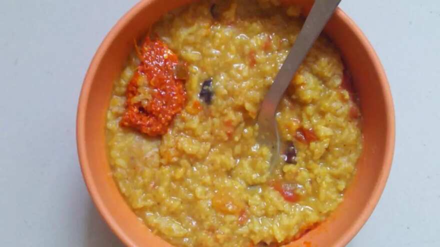 Wash equal parts of yellow moong dal and rice. Roast the dal for a few minutes until it smells cooked. Combine with rice and cook in plenty of water with a little salt and a pinch of turmeric. Keep the flame low so it does not stick to the bottom. Once everything is soft, you can stir in some ghee and eat it hot. It is not spicy. It does not have onion or garlic. It is meant to be very light and easy to digest.
