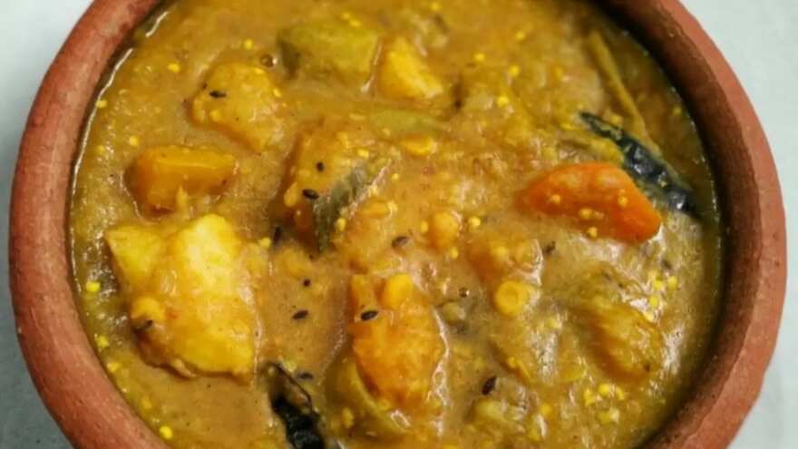 Use arhar dal or moong dal and cook it until it is soft. Add vegetables like raw banana, pumpkin, and arbi. Cut them into medium pieces so they do not become mushy. Add turmeric and salt, and cook everything together. For the tempering, heat ghee in a small pan and add cumin seeds, grated ginger, and a dry red chilli. Pour this into the dal and vegetable mixture and stir gently. Some people also sprinkle a mix of roasted cumin powder and pepper powder just before serving.