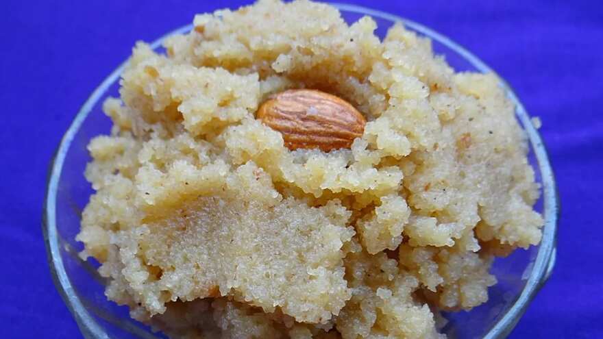 To make it at home, take some ghee in a heavy pan and heat it on a low flame. Add an equal quantity of wheat flour and keep stirring. The flour will change colour and smell nutty after ten to twelve minutes. In another pan, mix sugar and water and bring it to a boil. Once the sugar melts, add it slowly to the roasted flour. Stir well so that lumps do not form. Cook it until it thickens and the ghee starts to separate. It tastes best when eaten warm.