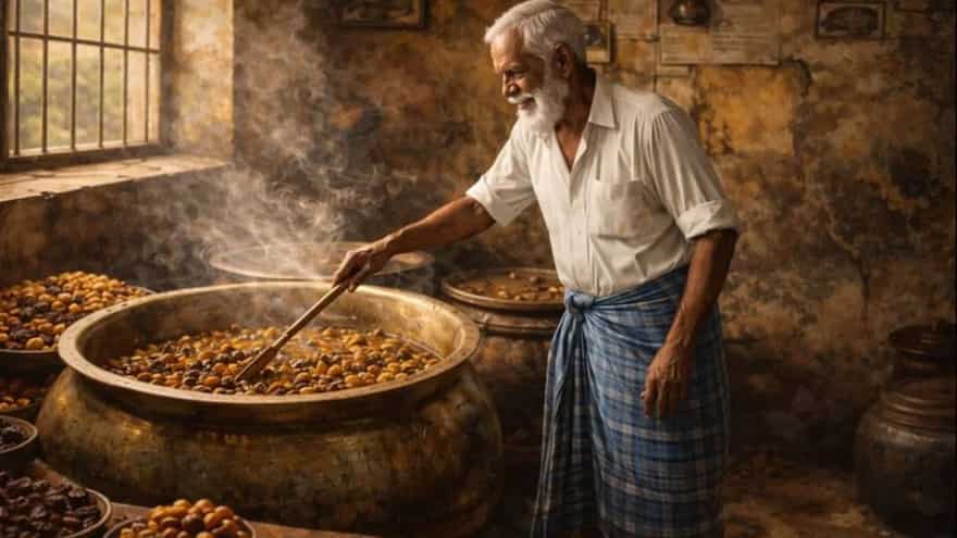 Its flavour profile remains distinct: rich but not cloying, dense yet restrained. Clove, nutmeg and cinnamon announce themselves on the nose but recede politely on the palate. Fruits — raisins, prunes, figs, dates, orange peel — are still soaked for months, sometimes a year, often stewed in urlis that bear the marks of decades of use.