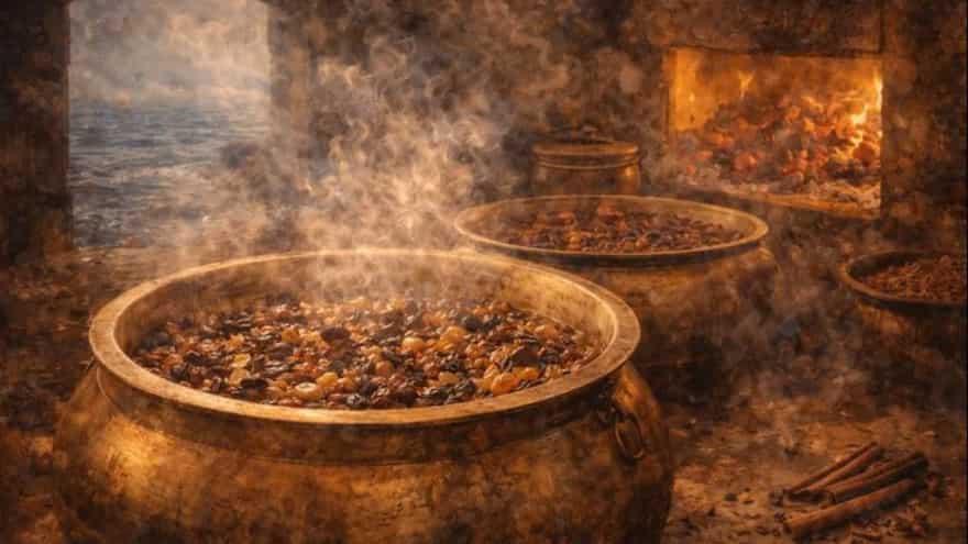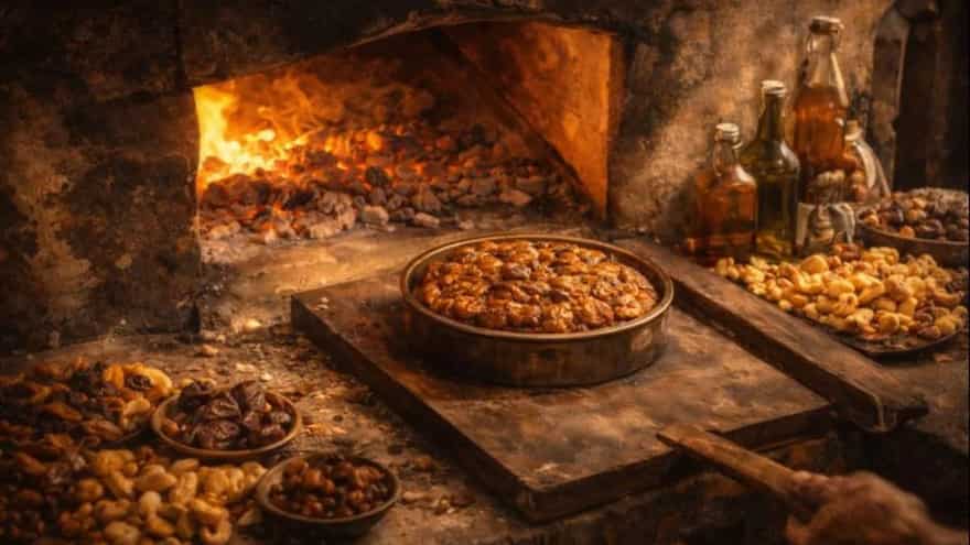 The air grows heavier, almost sticky with anticipation: wine-soaked fruit, caramelising sugar, clove and cinnamon blooming under heat. The sea is close enough to be felt, if not seen — the salt in the breeze mingling with the smoke from wood-fired ovens that have been lit before dawn. Inside old bakeries, bell-metal urlis simmer quietly, holding fruit that has been macerating for months, sometimes longer, waiting for its moment.