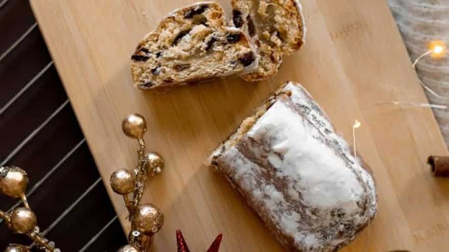 Stollen is a traditional German Christmas bread shaped like a folded loaf and dusted thickly with icing sugar so it resembles a snowy ridge. It contains dried fruit, candied citrus, almonds, and sometimes a marzipan centre. When sliced, the bread is soft and slightly buttery, with bursts of sweetness from the fruit. Dresden’s version, known as Dresdner Stollen, is one of the best known and has been made according to regulated standards for generations. To someone trying it for the first time, the bread tastes festive and slightly dense, similar to a lighter, less boozy fruitcake.