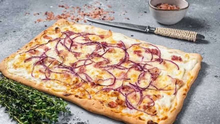 Flammkuchen is a thin, crisp flatbread originally from the border regions between Germany and France. It resembles an ultra-thin pizza but has a lighter base and a distinct set of toppings. The classic version is spread with crème fraîche and topped with finely sliced onions and small pieces of cured pork. Once baked in a very hot oven, the edges become crisp while the centre remains creamy. For someone unfamiliar with it, Flammkuchen feels both delicate and satisfying, with a balance of smoky, tangy, and savoury flavours.