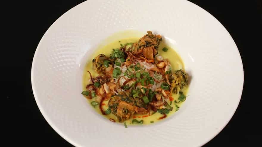 - Place the rice noodles in a bowl, add the pakoda, and pour the hot kadhi over it.