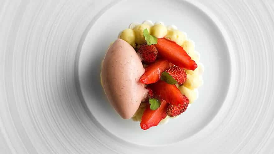 Immarti Waffle With Strawberry Chilli Ice Cream & Mango Vegan Espuma