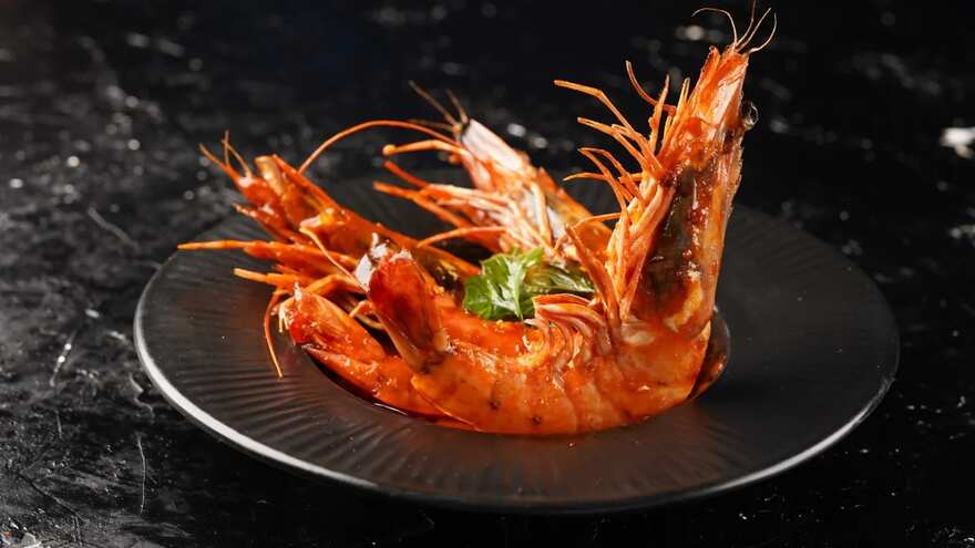 - Serve the prawns hot, garnished with the fried basil leaves.