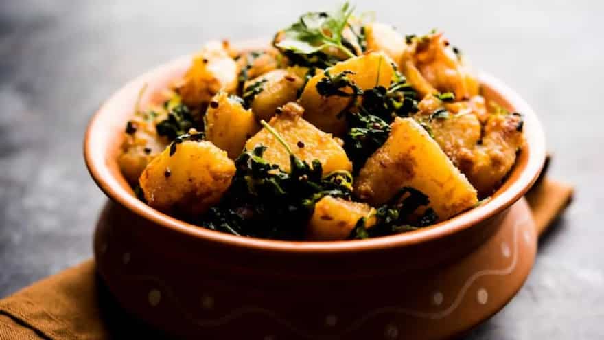 Simple but flavourful, aloo sabzi is often paired with khichdi during the Govardhan Puja. Lightly seasoned with turmeric, cumin, and mustard seeds, it is comforting, slightly tangy, and has a burst of flavours. The soft, well-cooked potatoes soak up the aromatic herbs, which go well with poori and khichdi nicely. Offered as a part of the festive thali, aloo sabzi perfectly balances the flavour and textures, which make the offering symbolic of plenty and wealth.