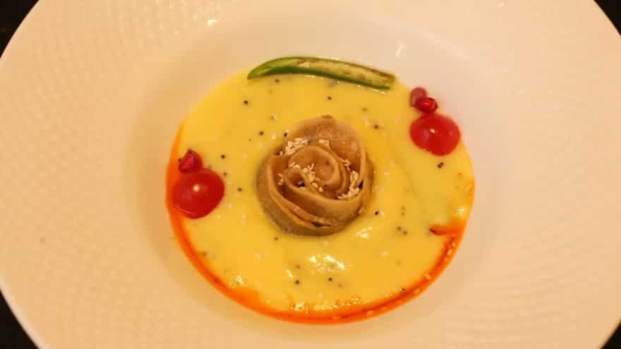 Following the footsteps of Chef Neha Deepak Shah, the stage was set with the same set of Aashirvaad ingredients and Usha appliances for the home chefs Astha Agarwal and Neha Gupta to battle. Taking inspiration from the streets of Delhi, Neha Gupta decided to whip up momo served with Gujarati kadhi. Transforming the classic momo for the stage, Neha kneaded a dough using atta and sooji, filled it like ravioli, and shaped it like a flower. Steamed to perfection, she served aesthetically pleasing momo in besan ki kadhi.