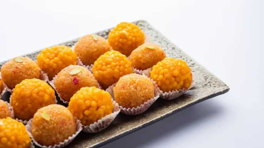 To make boondi ladoo at home, make a smooth besan batter and pour it through a ladle with a small pour into hot oil to make boondi. These boondis are soaked in warm sugar syrup flavoured with cardamom. Once they soak up the syrup thoroughly, they can be shaped into small bite-sized laddoos, which are sweet, fragrant, and also deeply comforting once you have them after offering them as a bhog.