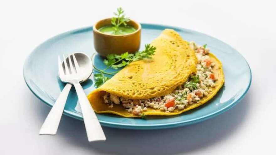 This is lighter than besan cheela. But it still gives enough energy till lunch. Soak split yellow moong overnight or for at least three hours. Blend with ginger, green chilli, salt, and a bit of ajwain. The batter should be smooth but not watery. Mix in finely chopped spinach or methi. Heat a flat tawa on the front burner. Pour one ladle of batter and spread it like a dosa. Drizzle some oil around and flip once the edges lift. Cook both sides and serve with chutney or even plain curd.