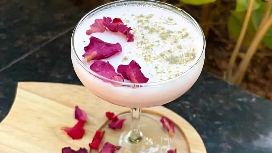 - Garnish: Dehydrated rose petals