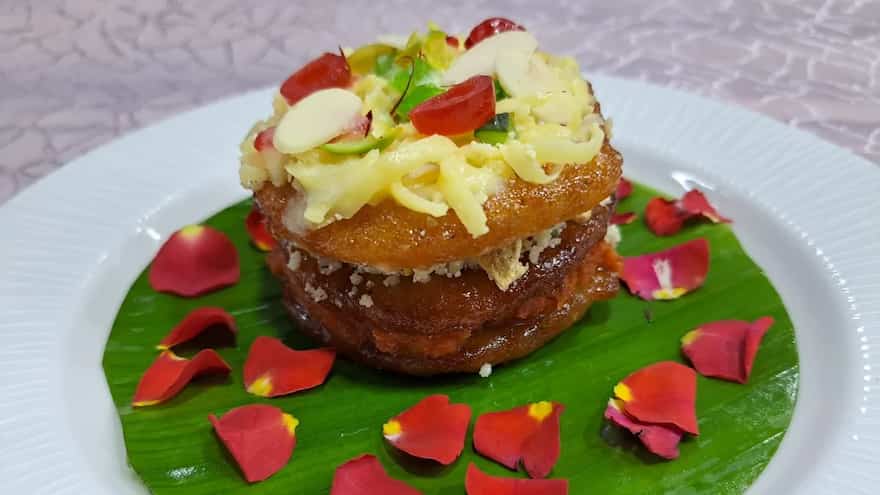 - Finally, place one malpua at the bottom of a serving plate or platter.