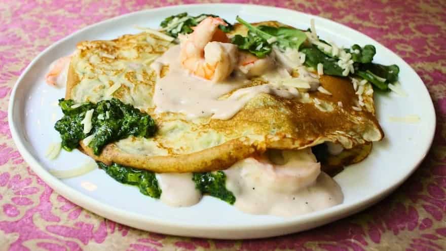 - Assemble by layering the pancakes with alternating spreads of spinach and prawn sauce.