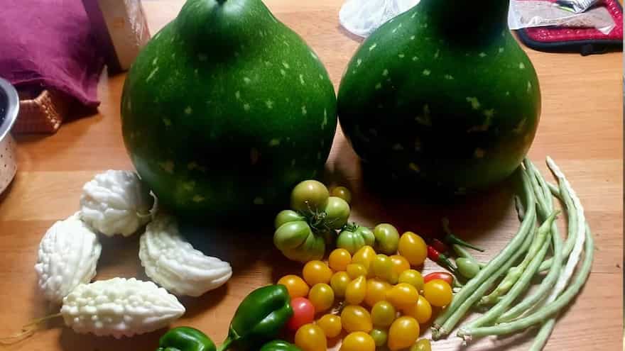 Though its 324 square foot space may seem modest, its 250 kg yield in 2023 and 350 kg in 2024 say otherwise. Walk through Asha's garden today and you'll find an impressive diversity: cucumbers and butternut pumpkin, green and red okra, onion chives and garlic chives, methi (fenugreek) and coriander, noodle beans and amaranth leaves, sponge gourd and snake gourd and ash gourd, hyacinth beans and tindli, basil and tomatoes, even turmeric that she dries and powders herself. There are pickled chillies and, when fortune smiles, the occasional sweet melon.