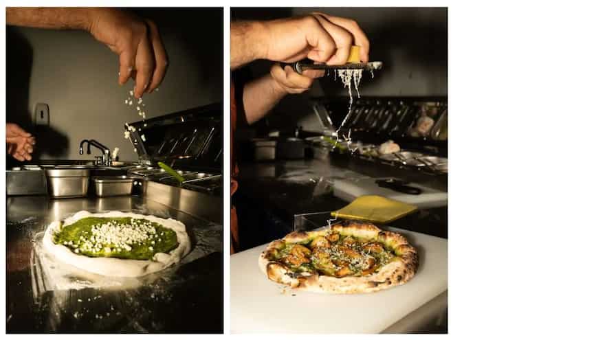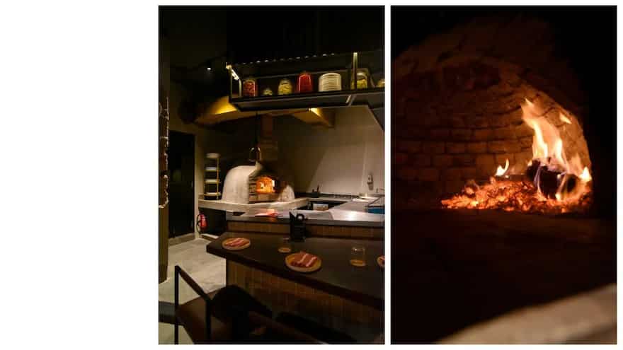 Once within the glass walls of Pizza No Cap, this little more than a month-old, 40-seater, ground-floor pizzeria with a workshoppy vibe, we were transported to a relaxed, easy-going environment. Under the soft light streaming out of cleverly-placed glass storage jars, one notices the glint of the polished grey cement floor, the metal folding chairs with their pop of coloured cushions, the aesthetically damaged patches of exposed brick, and design accents of industrial metalwork. From any of the seating options – counter-seating, communal tables and seating for gangs of four or intimate twos – one still has a view of the entire process of pizza-making from the dough to the fire. We chose to sit with our former fashion merchandiser at one of the tables for four with a direct view of the glowing mouth of the oven.