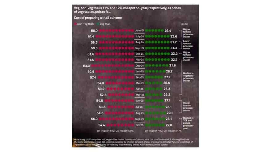 On the other hand, the price of pulses declined by 17% due to a surge in imports—Bengal gram witnessed a nine-fold increase whereas yellow peas rose by 85% and black gram by 31%. The report also stated that festive demand led to a rise in the prices of vegetable oil by 11% and LPG costs by 6%—thus limiting further decline in the costs of thali meals. Although the price of a standard non-vegetarian thali saw only a small drop in price due to the cost of broiler—which makes up for half the cost—reducing by a modest 6%, cheaper vegetables and pulses still managed to dip the price down. The RRR report, which tracks the cost of a standard home-cooked thali across regions within the country, offers practical insight into the impact of food inflation on household budgets.