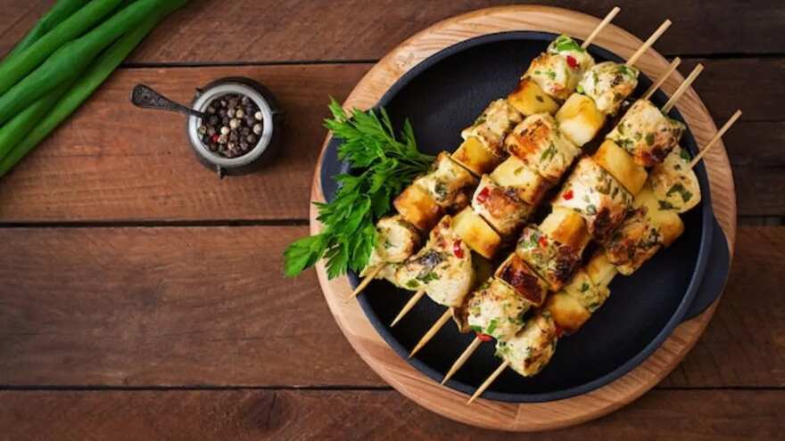 Sweet potato and paneer combine well to create a snack that feels festive and filling. Cubes of boiled sweet potato and paneer are alternated on skewers and coated with a marinade of yoghurt, rock salt, cumin powder, and black pepper. These skewers are then placed in the air fryer until the edges are lightly charred. Once served, they look vibrant on the platter and taste smoky without the need for grilling over open flame. A garnish of pomegranate seeds can be added on top for colour and freshness.