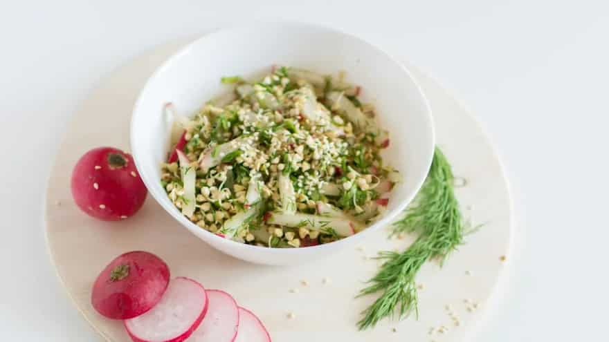 Requiring minimal prep and no cooking on the gas, this salad constitutes shredded cucumbers and salted peanuts coming together in a crunchy mixture. Add roasted peanuts, grated carrots, green chillies and freshly chopped coriander to build up the salad. Drizzle lime juice, olive oil, salt and pepper over the mixture to infuse a fresh and tangy acidity into it. The salad can also be prepared using raw papaya instead of cucumbers, if available, for that Asian-style spin. Add fresh red chillies instead of green ones if crafting the salad using raw papaya. Crush the peanuts to make them slightly coarse and then add them to the recipe so their nutty flavours become all the more pronounced. Serve the salad cold for the sheer summer vibe.