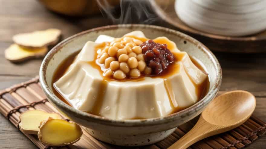 Douhua is a soft tofu pudding served with lightly sweetened syrup or savoury toppings, depending on the region. The tofu is set gently so it remains extremely delicate, almost custard-like. In sweet versions, warm ginger syrup is poured over the surface, adding fragrance without overpowering the soy flavour.