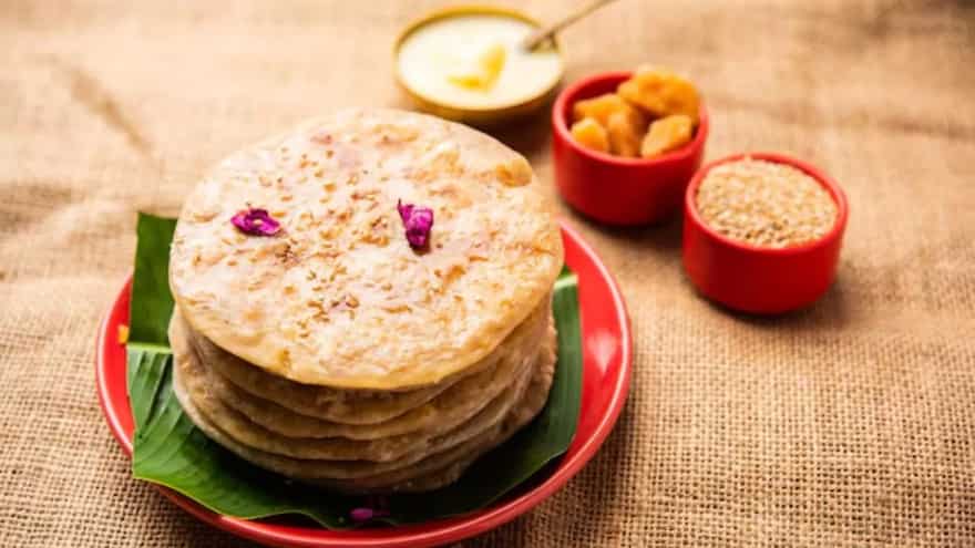 Gul Poli is prepared with a soft stuffing of jaggery, chana dal, coconut, and cardamom inside the dough, just like the classic puran poli. It is richer than regular puran poli as it is created for winter indulgence when the body requires warmth and supported energy. The jaggery melts into a deep, caramel-like sweetness, whereas coconut adds to the moisture and the texture. It is cooked with a generous amount of ghee and enjoyed hot, often after the kite-flying. Gul Poli represents abundance after harvest and is believed to be grounding, soothing, and festive.