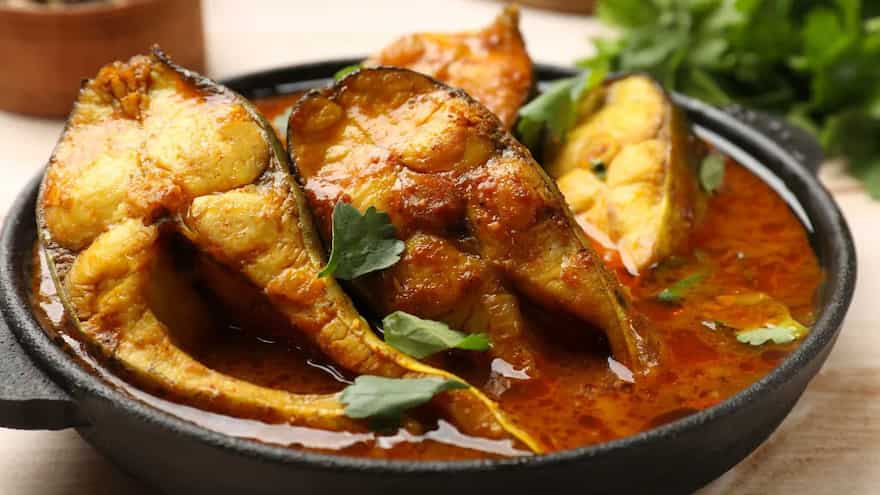 Katla kalia features big river carp served in a rich, Bengali-style curry. The fish is cooked with traditional spices to create a hearty and flavourful dish. It is a popular choice for seafood lovers visiting the local restaurants in Shantiniketan.