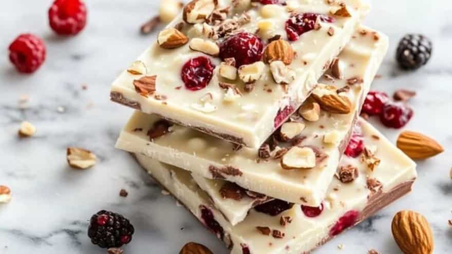 Milk chocolate remains a seasonal favourite, and dried cranberries bring a bright, tart flavour that lifts the entire confection. Indian supermarkets and online stores stock cranberries throughout the year, which makes them easy to include in holiday treats. Once the milk chocolate spreads evenly across the tray, almonds can be placed across the surface in a loose pattern. Cranberries can be pressed lightly into the warm chocolate so they hold their shape as the bark cools. The almonds contribute a firm bite, and the berries introduce a vivid colour that suits winter celebrations. This combination appeals to children and adults alike, and it remains one of the more accessible variations for households preparing large quantities of festive treats.