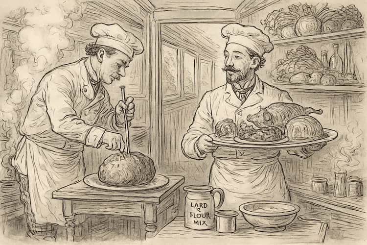 Menus became regional showcases. The Northern Pacific Railway boasted potatoes weighing up to two kilos, cooked evenly by stabbing them with ice picks; the Chicago, Milwaukee & St. Paul offered Christmas feasts of antelope steak, stuffed suckling pig and pheasant in aspic. In cramped kitchens where temperatures hit 51°C, chefs turned out multi-course meals using ingredients picked up along the route. One such innovation — a pre-mixed blend of lard and flour used on Southern Pacific trains — would later inspire what became known as Bisquick.