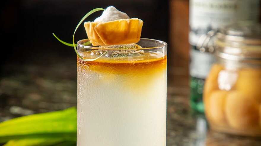 - Garnish with tart, sour cream, coconut foam, and pandan leaves.