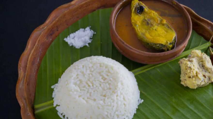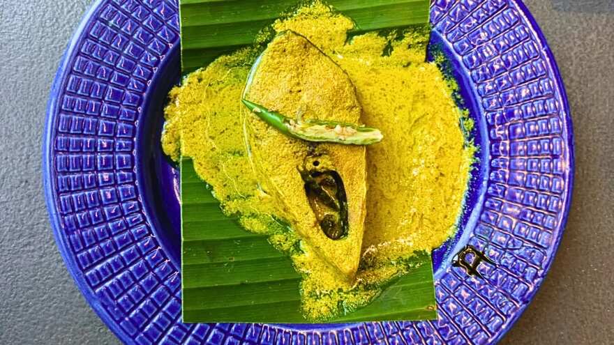 Hilsa is marinated in mustard paste and coconut, then steamed to let the delicate fish absorb all the flavours.