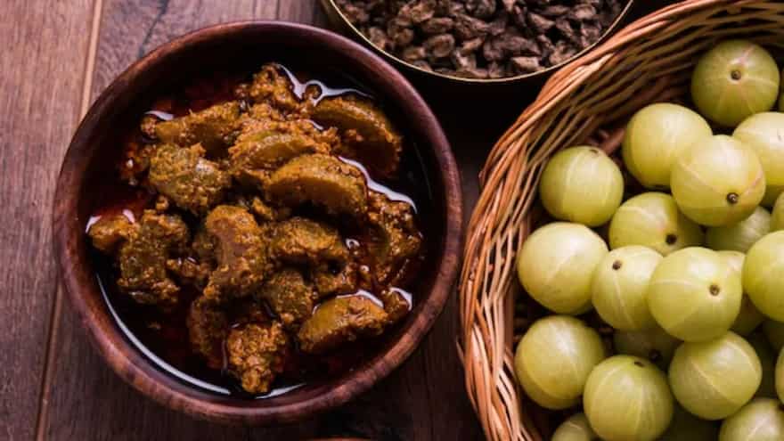 Amla achaar is winter health disguised as a flavour shell. The naturally sour taste of gooseberries is simmered lightly or kept raw, then combined with mustard oil, fenugreek, red chilli, and rock salt. Over days, they turn tender and soak up all the spices, changing from sour and sharp to an addictive condiment. Every bite delivers a burst of tang, gentle bitterness, and seasoning, pairing beautifully with rich winter curries and sabzis. Loaded with vitamin C, this achaar does not just pep up your plate, but it quietly supports your immunity during the peak winter season