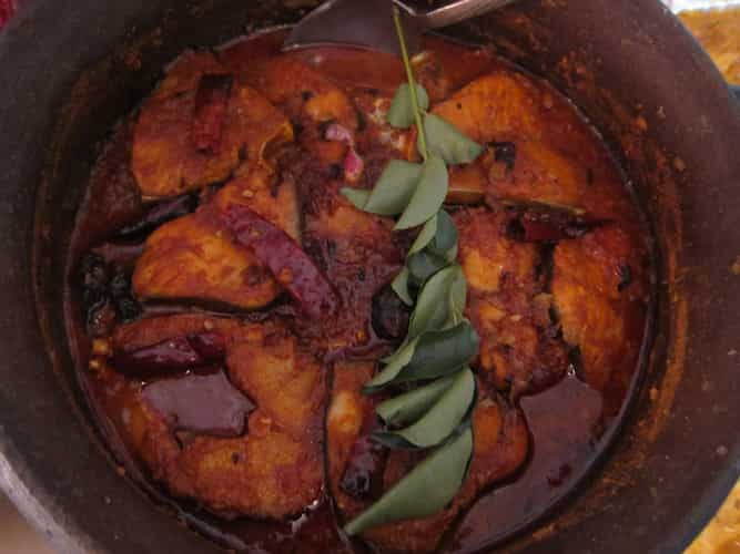 What makes this prawn stir fry preparation distinct is the use of kokum as its key souring agent—unlike tamarind—which most South Indian cuisines utilise liberally. Tiny prawns are stir fried with pearl onions, ginger-garlic and green chillies before being given a tangy flavour boost from the mauve petals as well as a generous sprinkling of fresh coconut and curry leaves. The dry preparation, which serves as an accompaniment to meals cooked in a Syrian Christian household, is then rested for 20-30 minutes for the flavours to intermingle, before it is relished. The juxtaposition of sweet coconut with the tart kokum or kodampuli makes the preparation one that is staple.